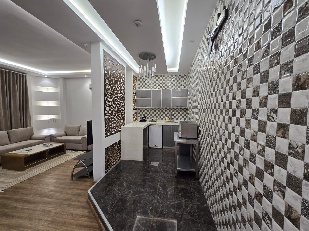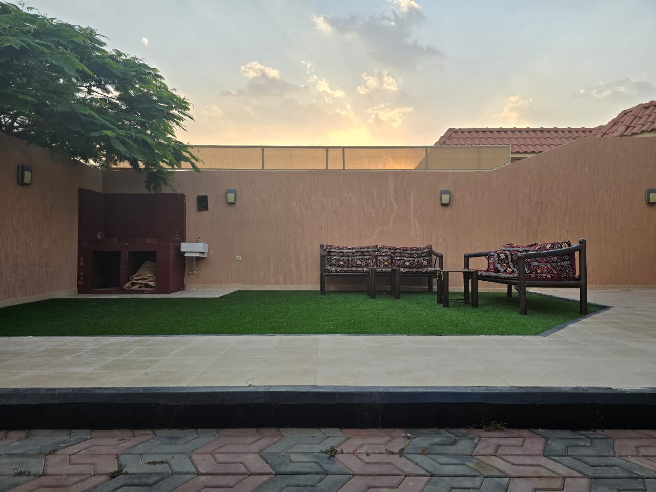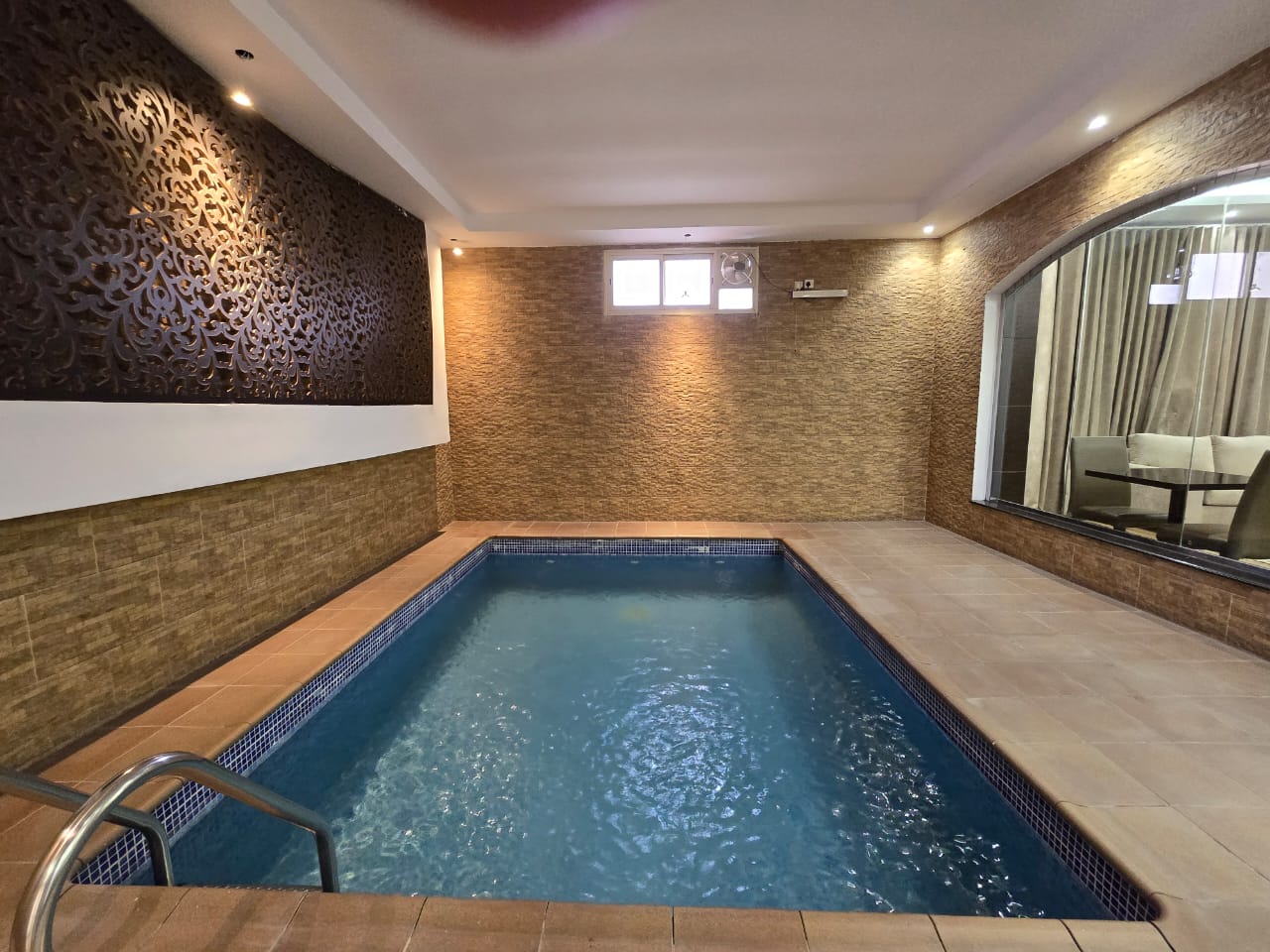 شالية يتكون من غرفه وصالة وحمام سباحة وجاكوزي ودورتي مياه وجلسة خارجيه مجهزه للشواء وباركنج سياره