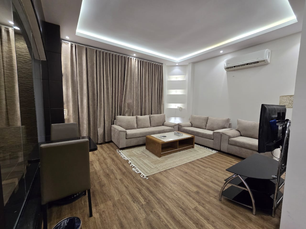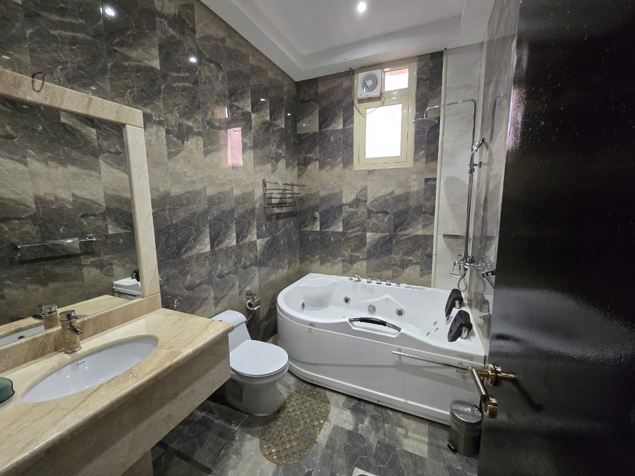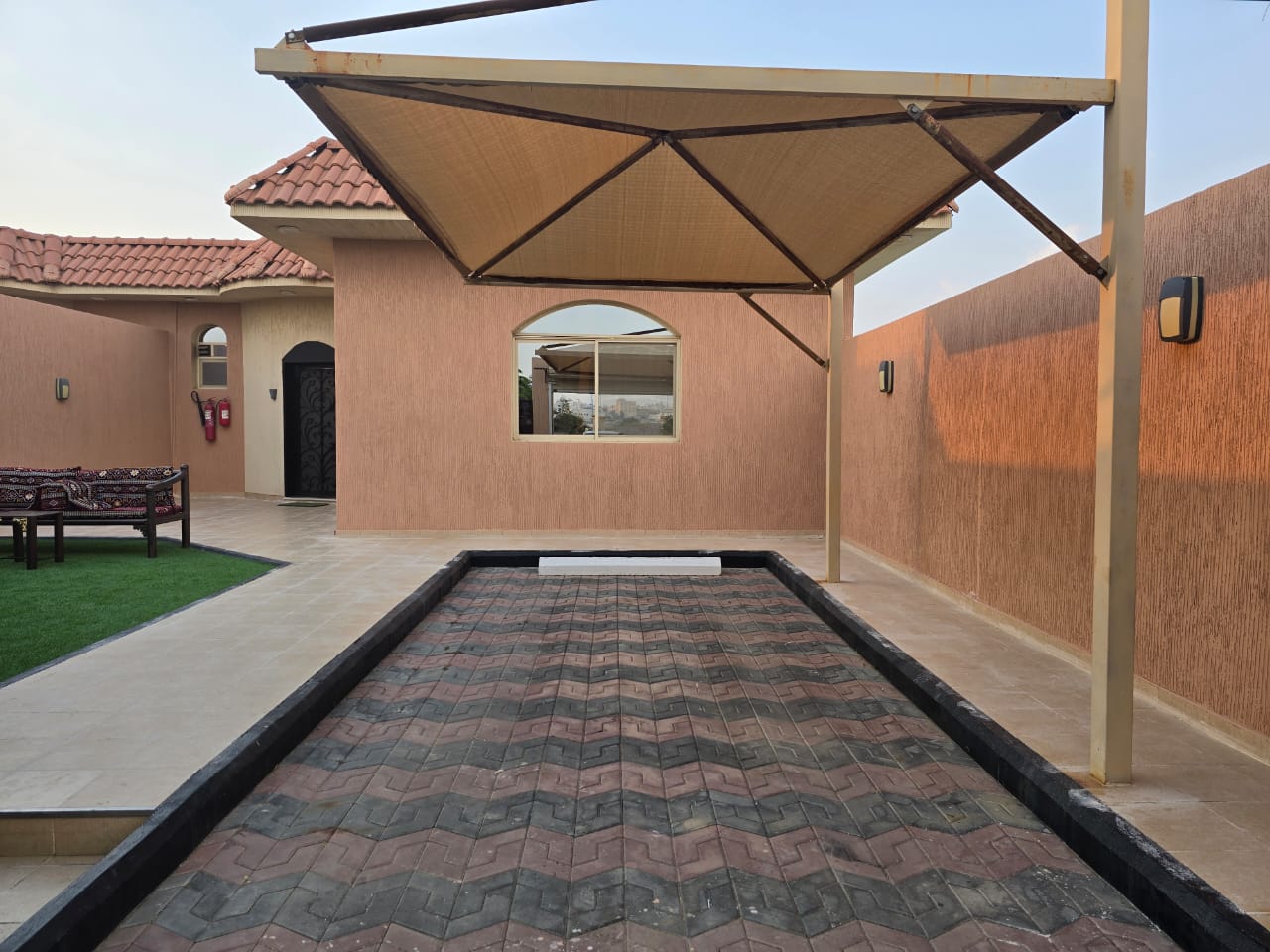 شالية يتكون من غرفه وصالة وحمام سباحة وجاكوزي ودورتي مياه وجلسة خارجيه مجهزه للشواء وباركنج سياره